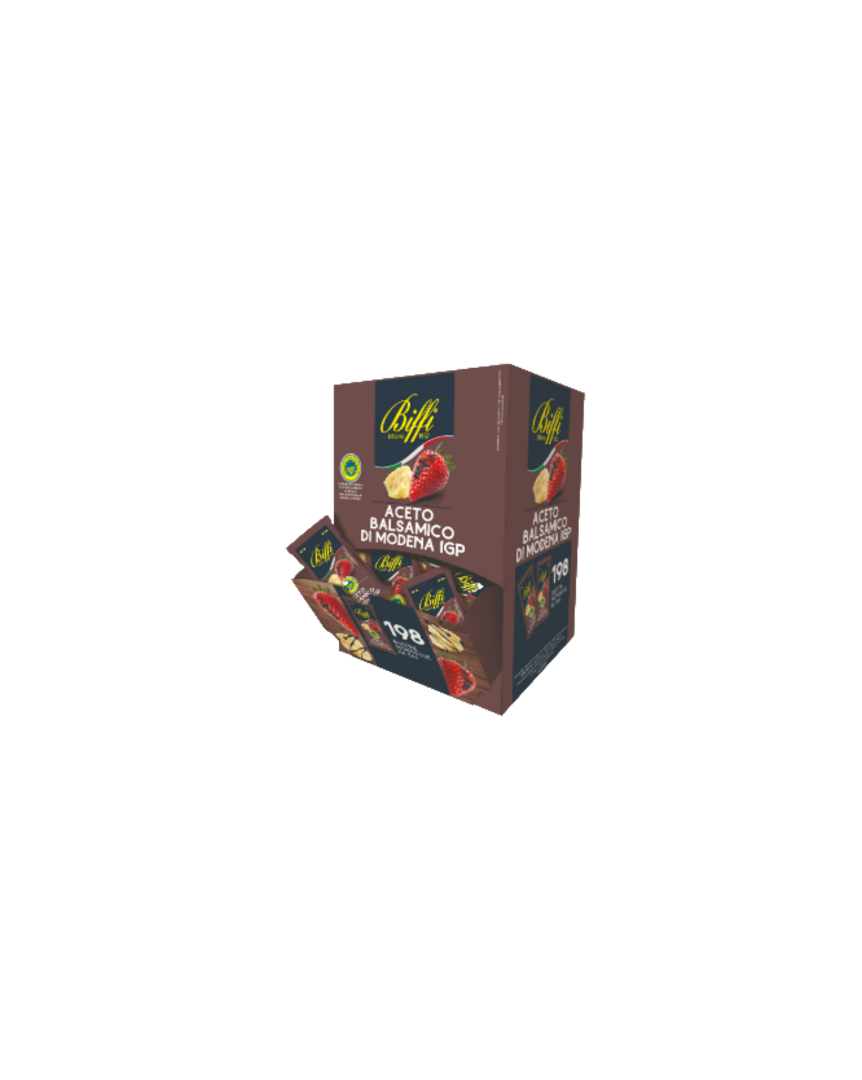 L’Aceto Balsamico di Modena IGP Biffi è perfetto per i condimenti di insalate e secondi piatti. In un pratico formato monodose, 198 bustine da 5ml. Ideale da portare per i vostri pranzi fuori casa.