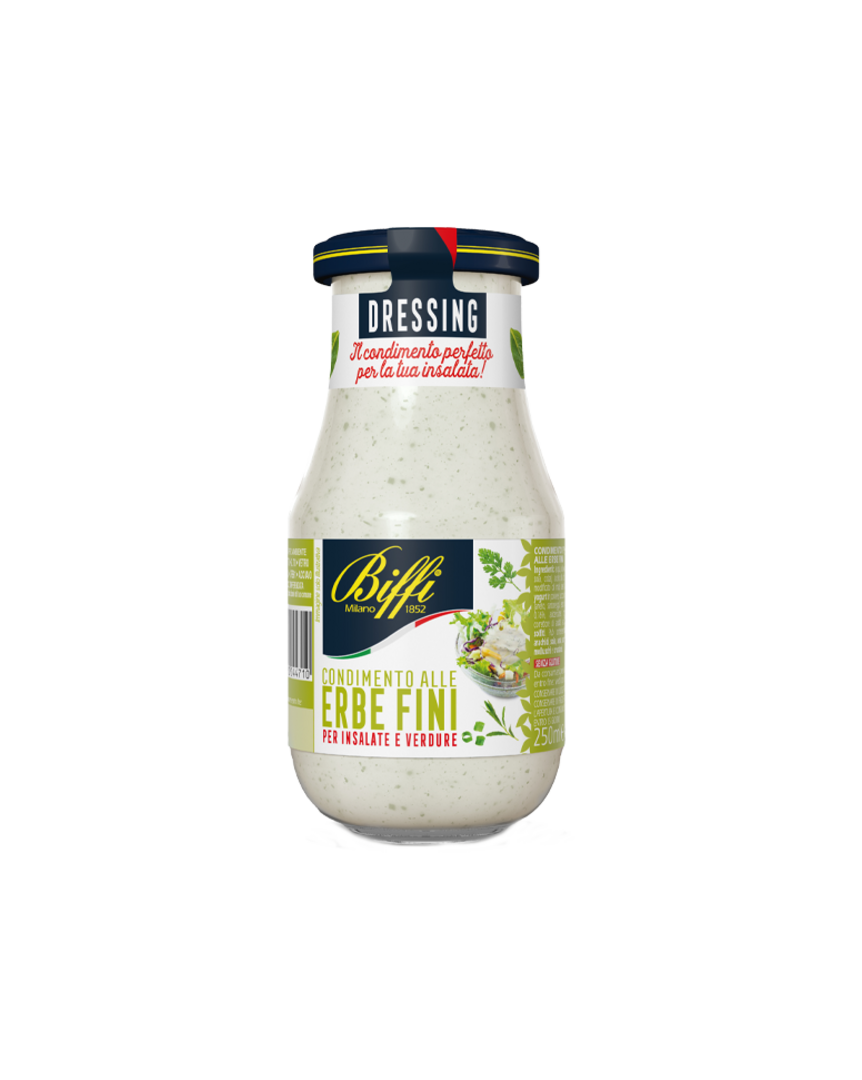 Il dressing alle erbe fini Biffi è un connubio perfetto di aneto, santoreggia ed erba cipollina, sapientemente dosati per esaltare il gusto di ogni piatto. Conquisterà il palato con la sua armonia di sapori e la sua versatilità. Un vero e proprio tocco di gusto per arricchire le tue ricette.